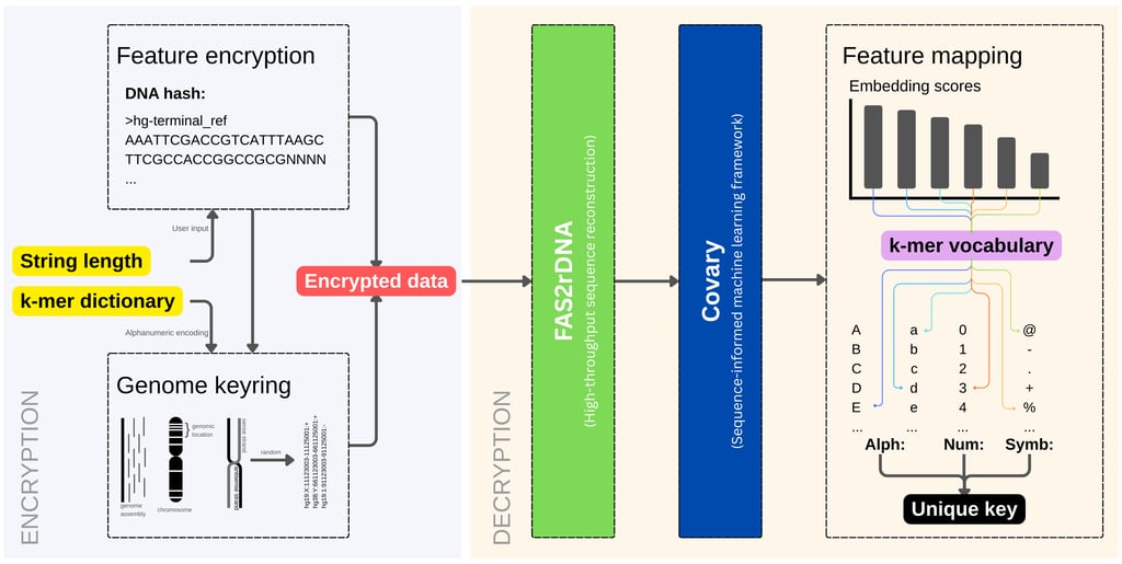 Covary encodes the reconstructed DNA using feature expansion derived from TIPs-VF (refactored as Covary_encoder), enabling pattern extraction without reliance on frequency-based or reducible signatures. This design ensures that the transformation pipeline remains traceable but non-reversible, a key requirement for cryptographic robustness. The output of Covary is a set of vector embedding scores that represent deep, learned sequence relationships that can be used to map the embeddings with the alphanumeric characters and symbols that are encoded in a kmer dictionary.