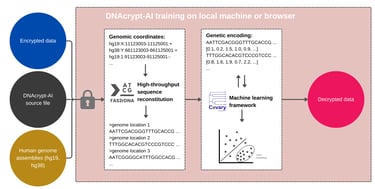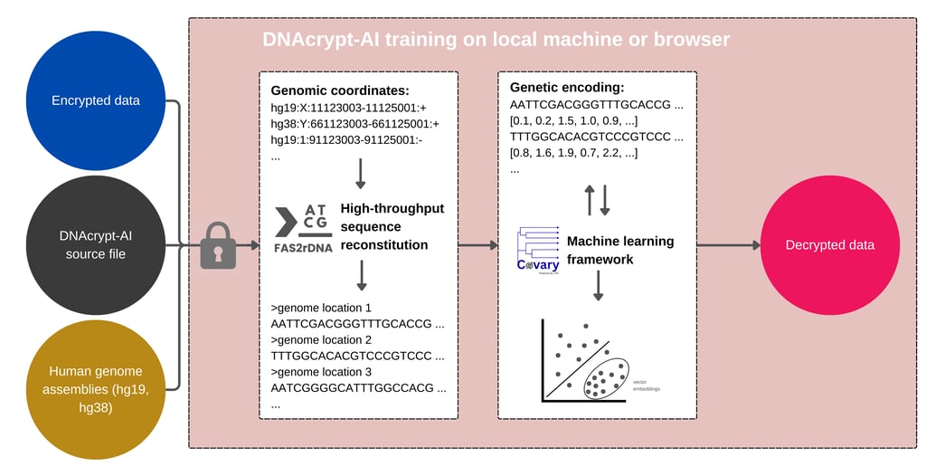 DNAcrypt-AI (in Jupyter notebooks) runs entirely in your browser, and DNAcrypt-AI does not collect nor store your data in the cloud or local server. Furthermore, the cipher does not index your encrypted data, nor does it utilize a pre-packed knowledge base or vector store of genomic vocabularies (such as encoded human genome sequences or k-mer dictionaries used in alphanumeric/symbol encoding). By design through Covary, users train and run DNAcrypt-AI locally, ensuring that user data remains exclusively theirs. Please note that machine learning inference is computationally intensive, so expect a processing time of approximately 15 minutes to successfully decrypt your password or key.